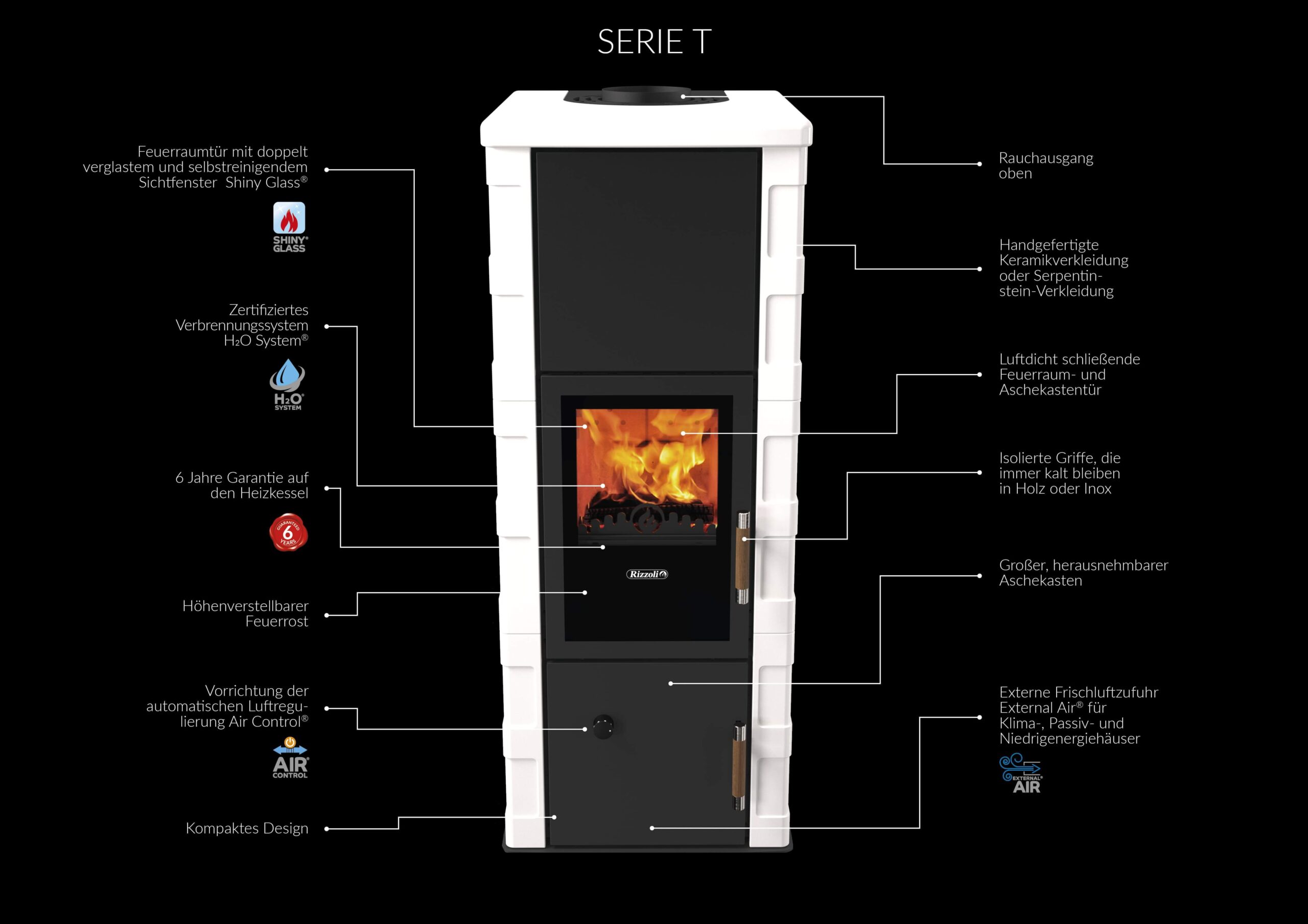 Diese kompakten Zentralheizungsöfen mit 60cm Breite und 120cm Höhe, haben eine Nennwärmeleistung von 20 kW und einen Wirkungsgrad über 85%. Die Serie T besteht aus 6 Modellen, unterteilt in drei Familien: T Line, T Rock und T Art, welche in zwei Versionen mit und ohne Backofen erhältlich sind. Alle Zentralheizungsöfen haben eine große Brennkammer mit höhenverstellbarem Feuerrost und Sicht aufs Feuer und können in lackierter Stahl-Ausführung, Serpentinsteinverkleidung oder handgefertigter Keramikverkleidung geliefert werden.