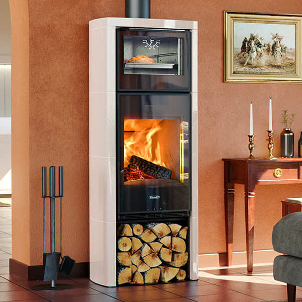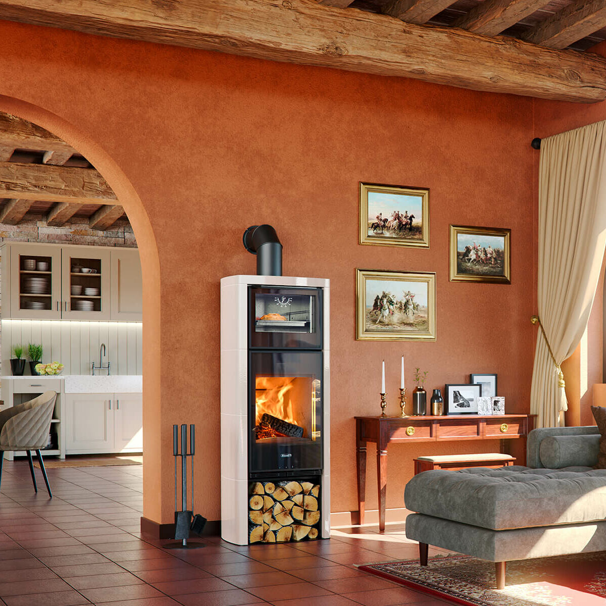 Hochwertiges Rohmaterial, moderne Technologie und feinste handwerkliche und detaillierte Verarbeitung. Das sind die Eigenschaften, die dieses Modell kennzeichnen, ein Kaminofen der durch die edle und handangefertigte Keramikverkleidung charakterisiert ist. Die Variante Chef ist mit einem großen Backofen unmittelbar oberhalb der Brennkammer ausgestattet. Der Backofen ist vollständig in Edelstahl realisiert und ist mit einem Backblech und einem doppelt verglastem Sichtfenster mit Thermometer ausgestattet. Auf Anfrage ist eine Holzaufbewahrung mit schließbarer Tür erhältlich (Optional).