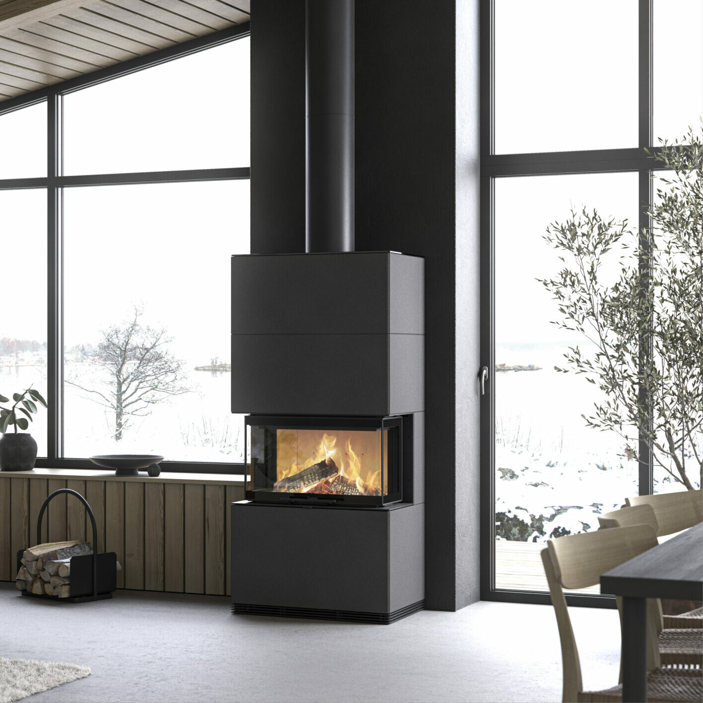 Das ist ein formgegossener und geschliffener Betonstein mit einer samtig anmutenden Oberfläche, den Sie ausschließlich bei Contura erhalten. Auch dieses warme Material verleiht jedem Kaminofen einen individuellen Charakter. Das Ganze lässt sich mit einem Brennholzfach aus schwarz lackiertem Stahl ergänzen.