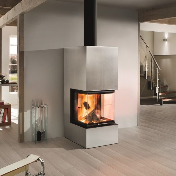Ein Kaminofen, der durch seine geraden Linien und einer großen U-förmigen Feuerraumtür definiert wird. Große 6 mm starke Stahlflächen schaffen eine beeindruckende Bühne für das Feuer.