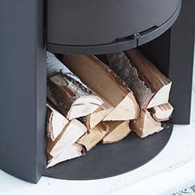 Ein praktisches Fach unter dem Kaminofen sorgt für Ordnung beim Brennholz und ist bei vielen Modellen standardmäßig vorhanden.