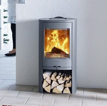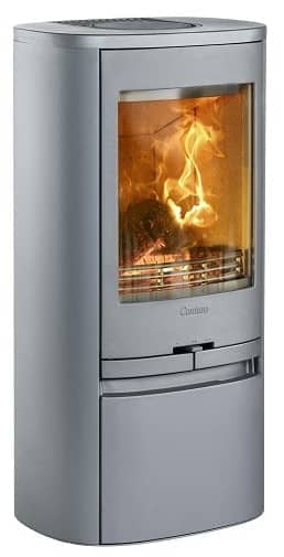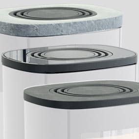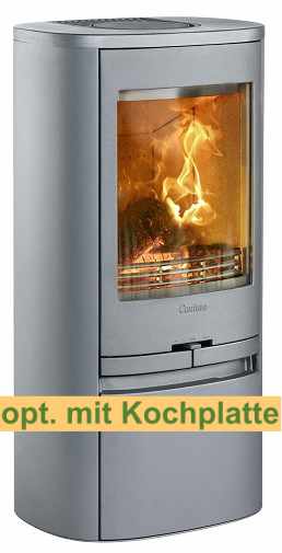 Das Basismodell der Serie ist in grauer oder schwarzer Farbe mit großer Türverglasung erhältlich. Der Schornstein lässt sich bei allen Modellen an der Ober- oder Rückseite des Kaminofens anschliessen.