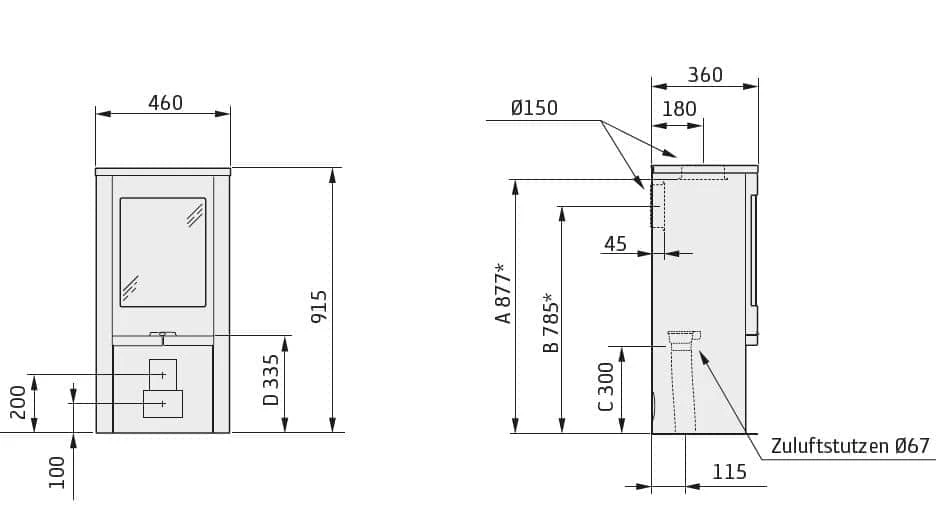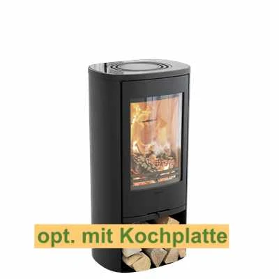 Das Basismodell der Serie ist in grauer oder schwarzer Farbe mit großer Türverglasung erhältlich. Der Schornstein lässt sich bei allen Modellen an der Ober- oder Rückseite des Kaminofens anschliessen.