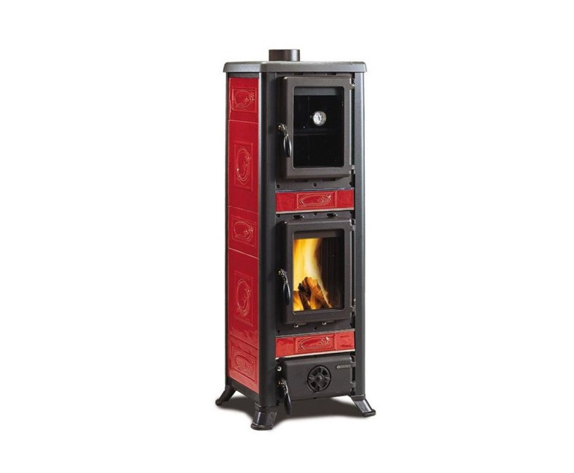 Holzofen mit einer Außenverkleidung im Kachel-Design und mit einem emailliertem Backblech ausgestattet.