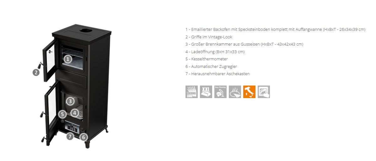 • Emaillierter Backofen mit Specksteinboden komplett mit Auffangwanne (HxBxT – 26x34x39 cm)
