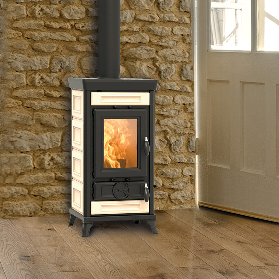 Kaminofen Thermorossi Sofia Evo (Höhe 91 cm) Maiolica beige-ahornweiß mit Kochplatte für Notfälle Lagersale
