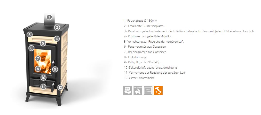 Die rationelle Form und das schlichte, sich auf die wichtigen Einzelheiten beschränkende Design machen diesen Ofen aufgrund seiner Sparsamkeit und Eleganz zu einem einzigartigen Produkt. Bei jedem Holznachlegen reduziert das innovative SMOKE BY PASS-System die Freisetzung von Rauchgasen in den Aufstellraum des Ofens drastisch.