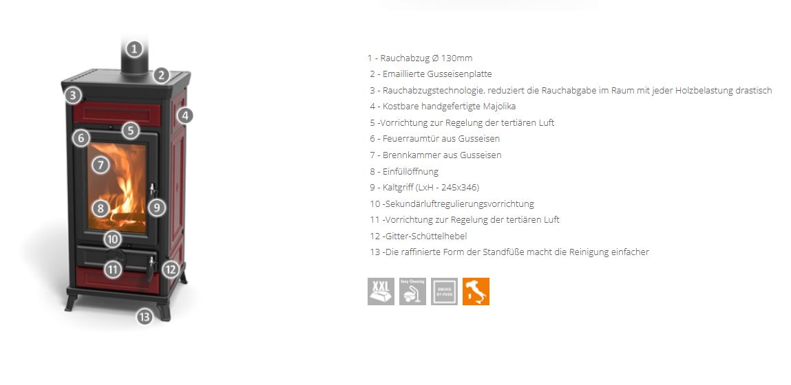 Vittoria ist die ideale Lösung für alle, die Nutzen, Solidität und Ästhetik auf kleiner Fläche suchen. Seine vertikal entwickelte Brennkammer erlaubt es Ihnen, den Charme des Holzfeuers zu bewundern. Das innovative SMOKE BY PASS-Gerät reduziert mit jeder Holzladung den Rauchaustritt in den Raum drastisch.