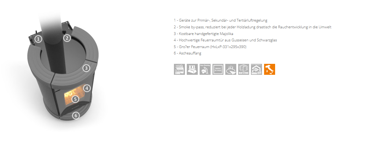 • Brennraum aus Gusseisen (HxBxT: 448 x 364 x 251 mm)