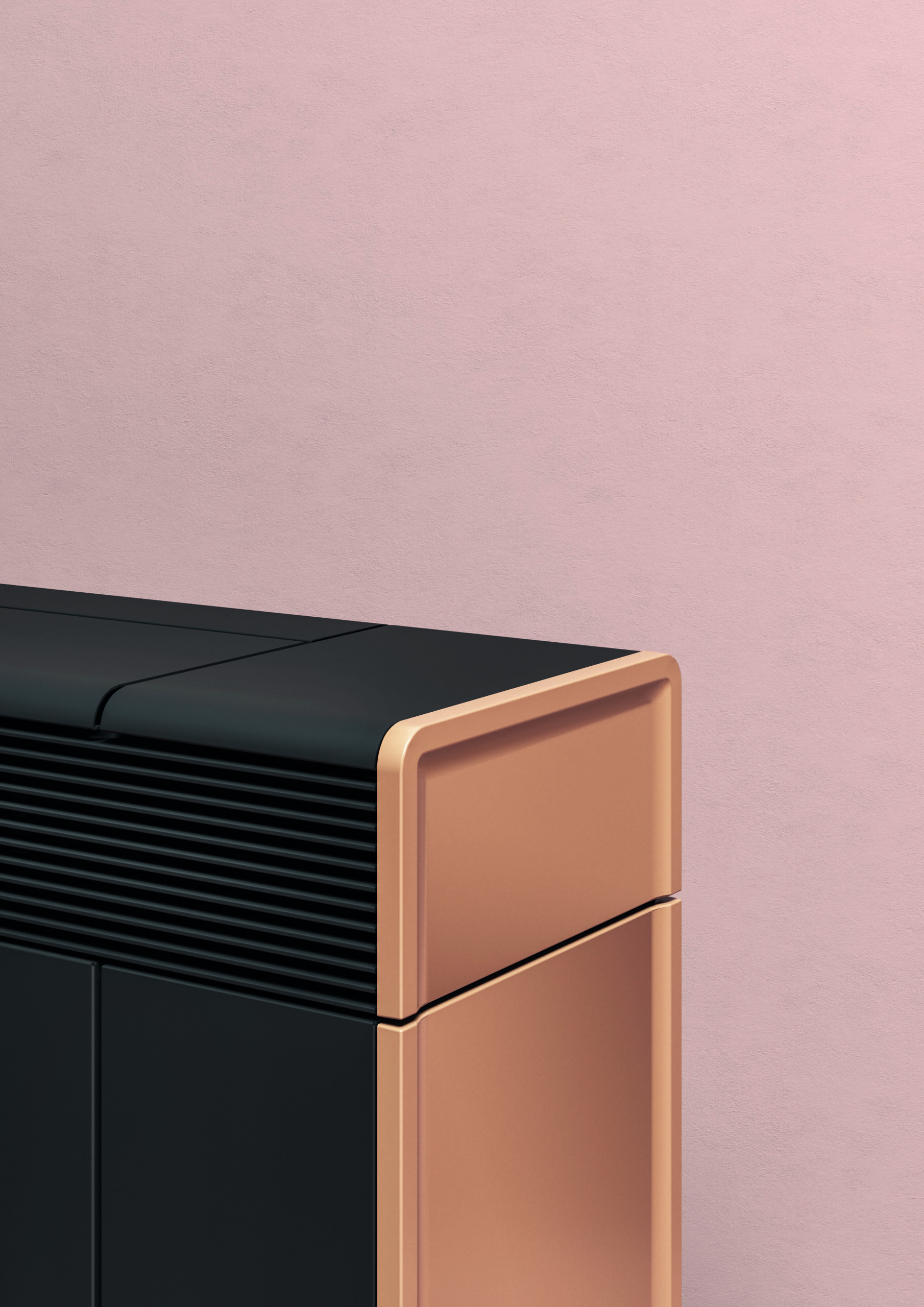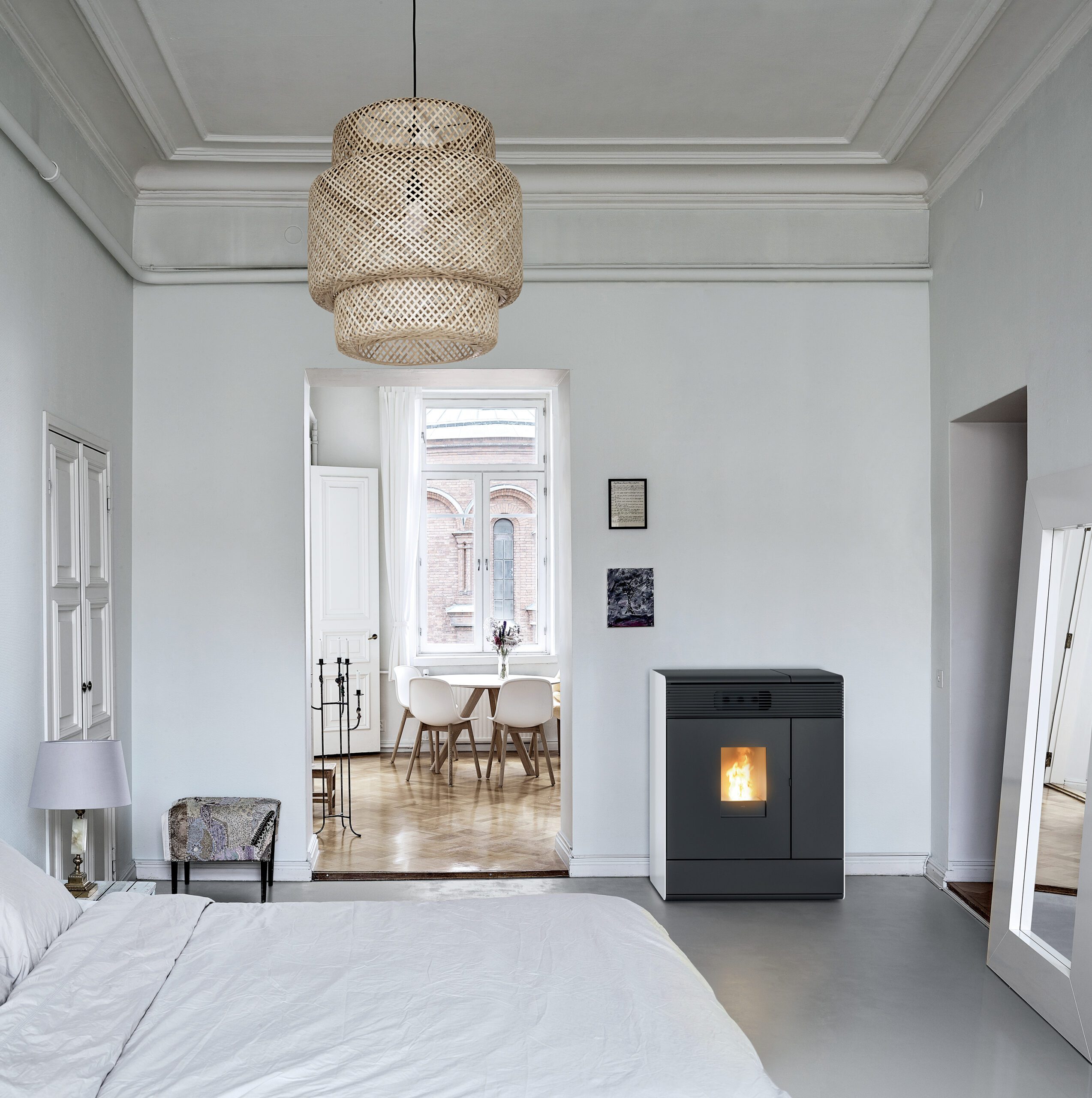 Wasserführender Slim Pelletofen mit geringer Tiefe (40,7 cm). Er wird in zwei Leistungsstufen angeboten: 16 kW für zirka 140 m2 und 24 kW für zirka 220 m2 große Wohnflächen. Intelligente Regelung der Verbrennung über die Technologie Maestro und mit zwei WLANs inbegriffen.