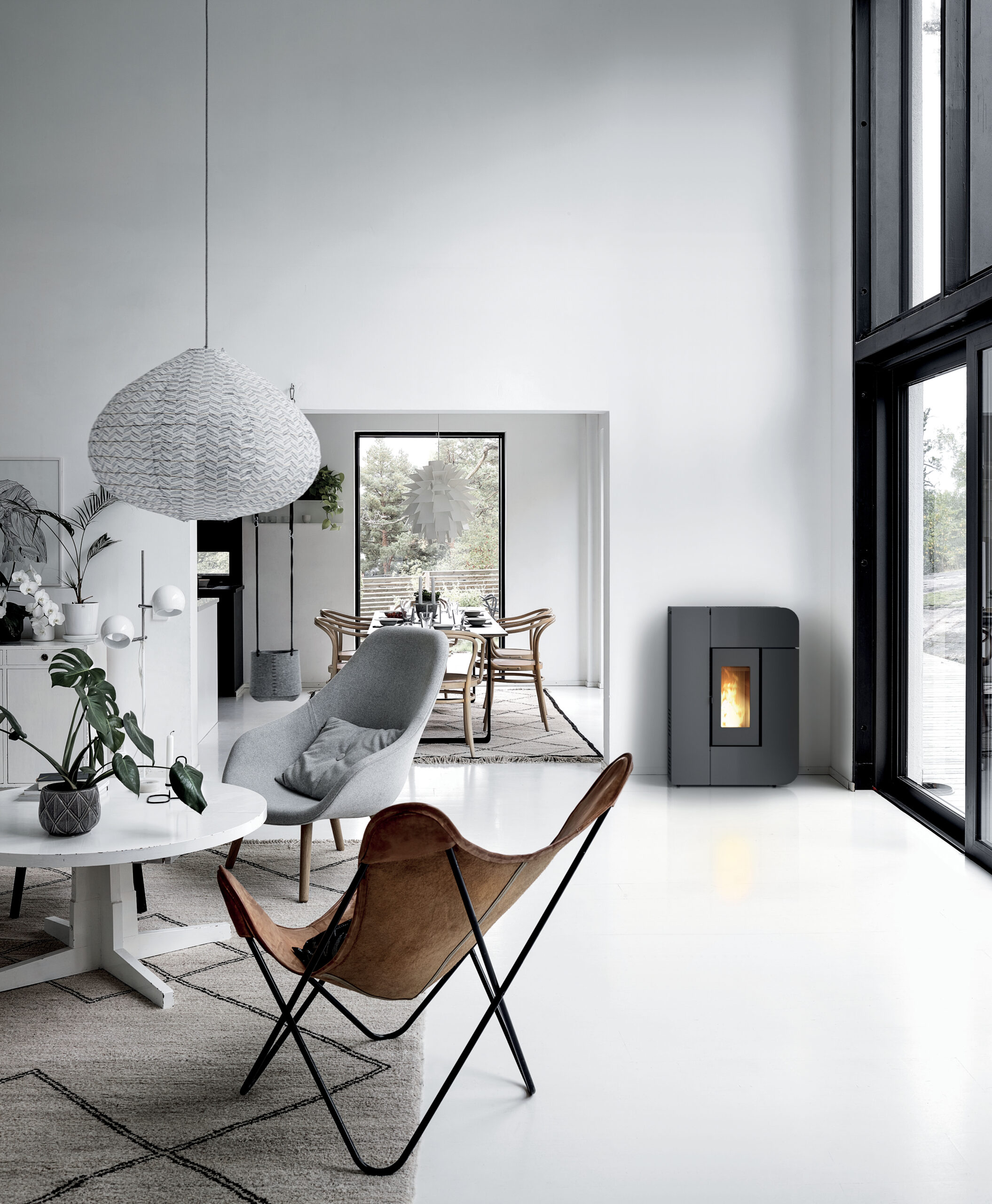 Dank seiner geringen Tiefe (27,5 cm) passt er ideal auch in kleine Räumlichkeiten. Der Rauchgasabzug befindet sich, wie auf dem Foto, an der Rückseite oder an der Oberseite (mit als Zubehör erhältlichem Kit), was eine besonders platzsparende Lösung darstellt.