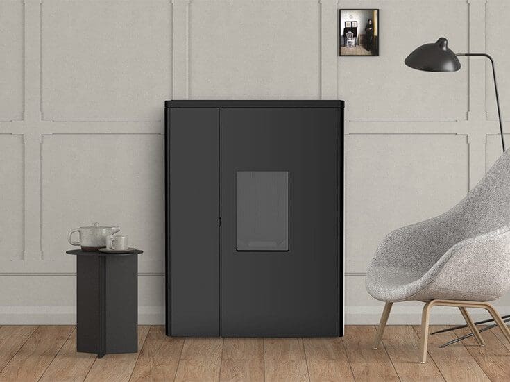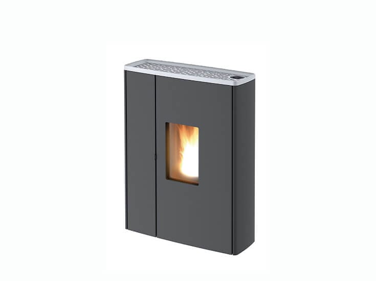 Dank seiner sehr geringen Tiefe (29 cm) speziell für kleine Räume geeigneter Pelletofen. Topplatte aus Gusseisen Black oder Aluminium; Stahlverkleidung mit Black-Lackierung. Frontales Einfüllen der Pellets. Doppeltür. Hermetisches Produkt mit Keramikzündkerze, die um 40 % reduzierte Einschaltzeiten gewährleistet. Zahlreiche Luftverteilungslösungen bei der Installation dank Möglichkeit zur Kanalisierung beider Luftauslässe. Dieses Produkt bietet mehrere Verwendungsmöglichkeiten. Man hat die Wahl, ob man zur Steuerung des Ofens zu Hause oder von unterwegs das Smartphone verwenden möchte oder die Bedienung zu Hause per „freestanding“ Fernbedienung mit Raumthermostat (optional) oder Bedientafel (optional) vorzieht.