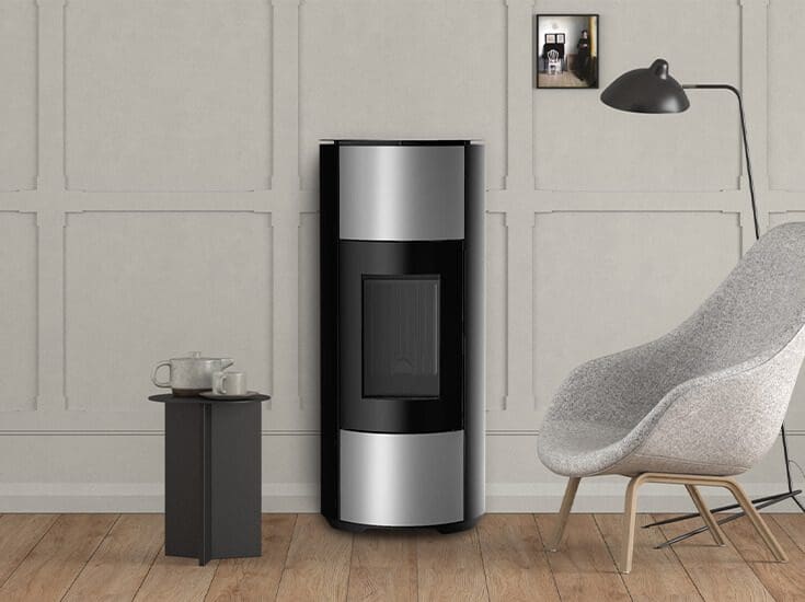 Pelletofen ohne frontale Luftöffnungen aus schwarzem Stahl und mit farbiger Vorderplatte (Aluminium, Silver, Dark, Bordeaux). Komplett neue, tiefere und höhere Feuerstelle, die die natürliche Bewegung der Flammen begünstigt. Besonders geeignet zum Aufstellen in einer Ecke. Möglichkeit, die Zwangsbelüftung völlig auszuschalten. Mit einer Keramikzündkerze, die um 40 % reduzierte Einschaltzeiten gewährleistet, ausgestattet. Dieses Produkt bietet mehrere Verwendungsmöglichkeiten. Man hat die Wahl, ob man zur Steuerung des Ofens zu Hause oder von unterwegs das Smartphone verwenden möchte oder die Bedienung zu Hause per „freestanding“ Fernbedienung mit Raumthermostat (optional) oder Bedientafel (optional) vorzieht.