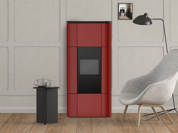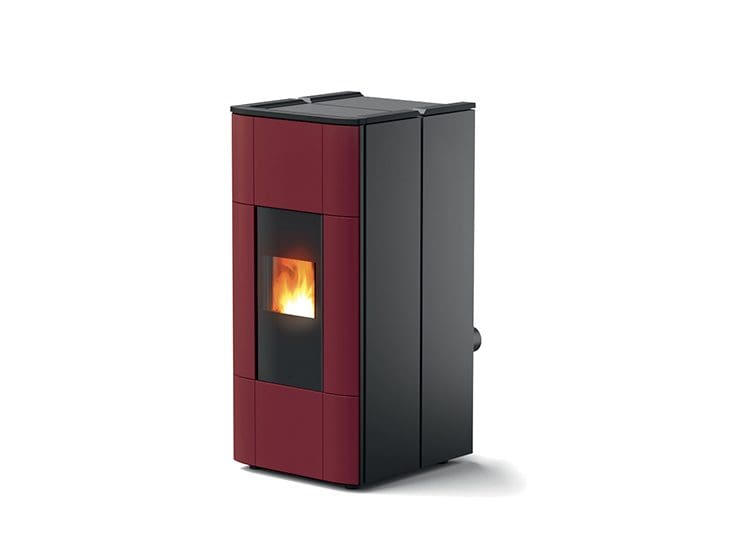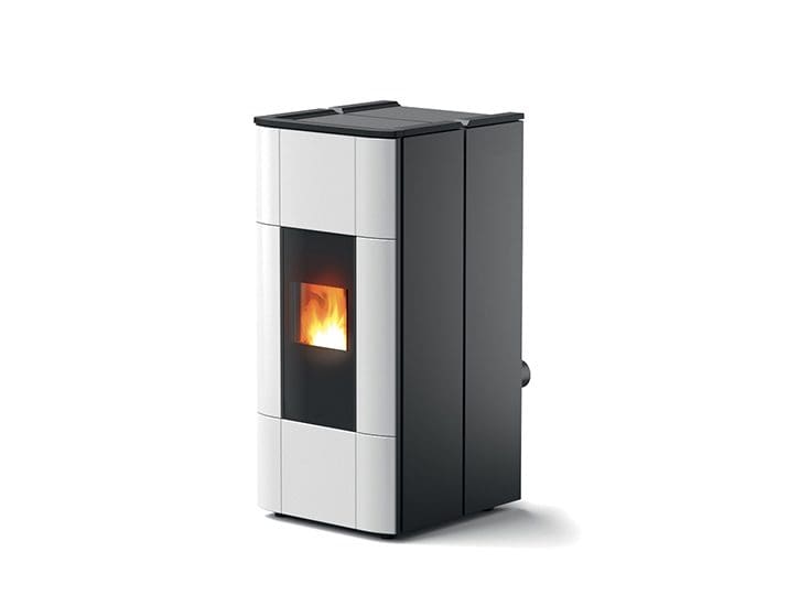 Pelletofen mit Front in Keramik in den Farben White, Bordeaux oder Black, Topplatte aus Gusseisen und Seitenteile aus schwarzem Metall. Produkt mit einer selbstreinigenden Brennschale aus Gusseisen mit wöchentlicher Aschenentleerung und automatischer Aschensammlung (aus dem Hauptfach und dem Rauchgasumlauf). Hermetisches Produkt mit Keramikzündkerze, die um 40 % reduzierte Einschaltzeiten gewährleistet. Dieses Produkt bietet mehrere Verwendungsmöglichkeiten. Man hat die Wahl, ob man zur Steuerung des Ofens zu Hause oder von unterwegs das Smartphone verwenden möchte oder die Bedienung zu Hause per „freestanding“ Fernbedienung mit Raumthermostat (optional) oder Bedientafel (optional) vorzieht.