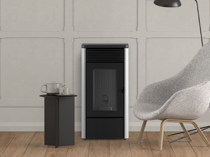 Pelletofen in modernem Look, mit Topplatte aus Gusseisen und Seitenteilen aus lackiertem Stahl (Bordeaux, White, Dark, Silver). Pelletofen mit geringer Leistung (6 kW). Möglichkeit, die Zwangsbelüftung völlig auszuschalten. Mit einer Keramikzündkerze, die um 40 % reduzierte Einschaltzeiten gewährleistet, ausgestattet. Dieses Produkt bietet mehrere Verwendungsmöglichkeiten. Man hat die Wahl, ob man zur Steuerung des Ofens zu Hause oder von unterwegs das Smartphone verwenden möchte oder die Bedienung zu Hause per „freestanding“ Fernbedienung mit Raumthermostat (optional) oder Bedientafel (optional) vorzieht.