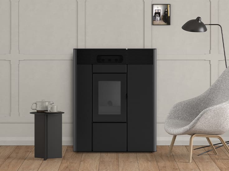 Hydro-Pelletofen mit Seiten aus Stahl in den Farben Dark, Silver, Bordeaux oder White. Möglichkeit die Zwangsbelüftung völlig auszuschalten. Hermetisches Produkt mit Keramikzündkerze, die um 40 % reduzierte Einschaltzeiten gewährleistet. Frontale Lüftung. Rauchgasabzug hinten oder oben.