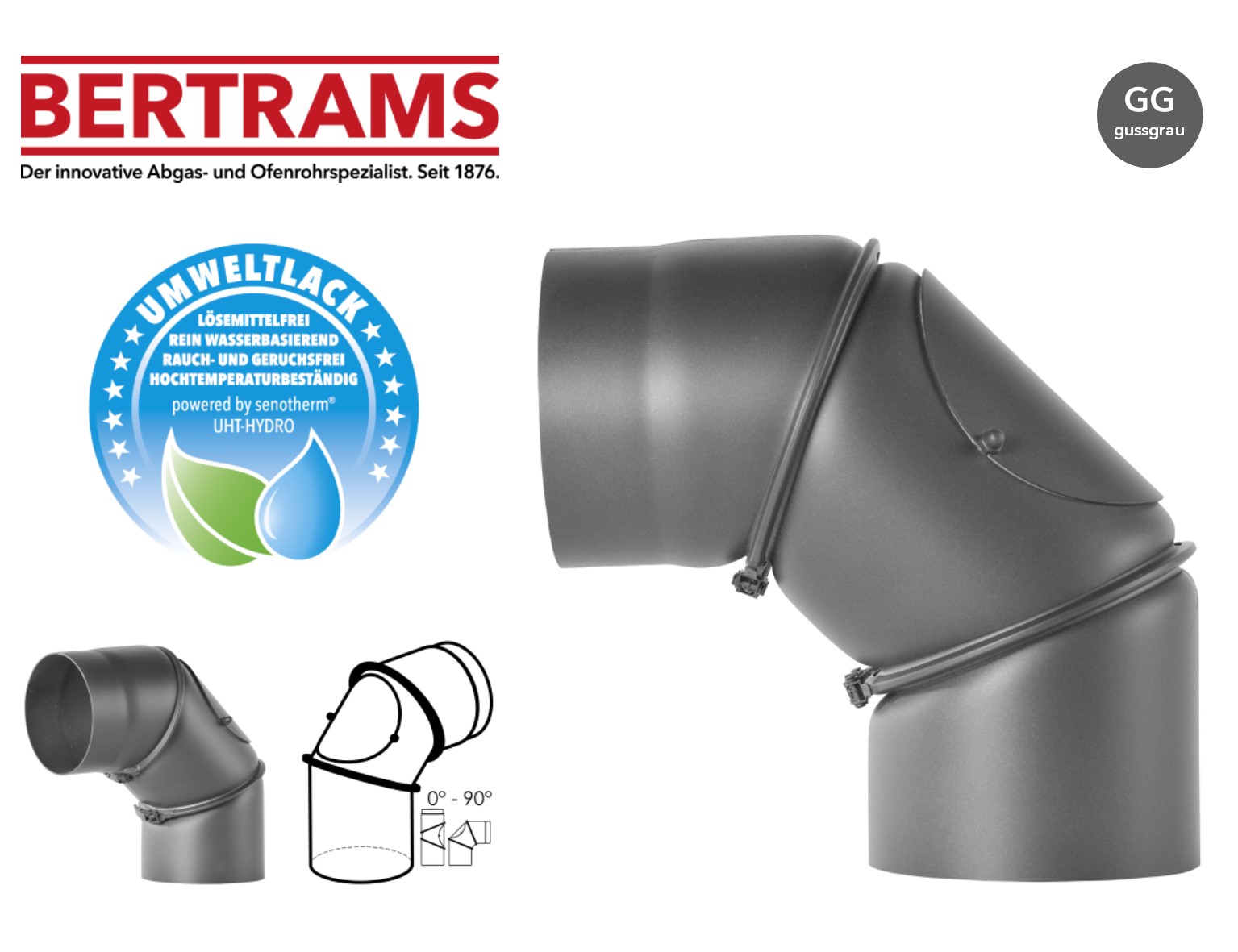 Rauchrohrbogen Bertrams 0° – 90° gussgrau Ø 150 mm mit Putztür