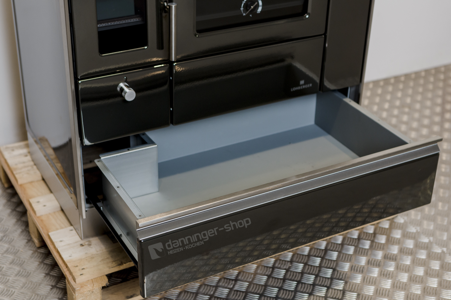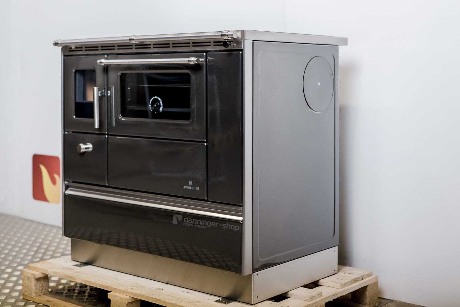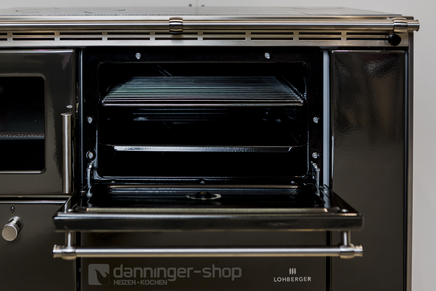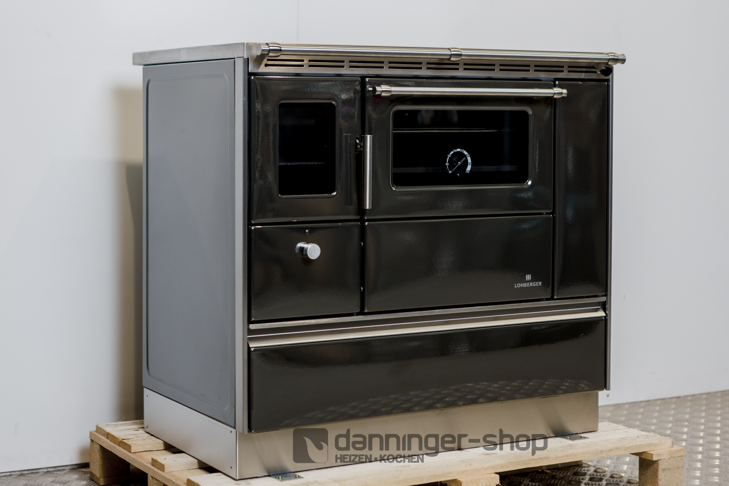 Tischherd Lohberger Rega 90 anthrazit metallic Anschluss Rechts Stahlplatte und mit Sichtfenster Special Sale
