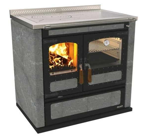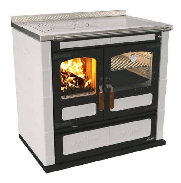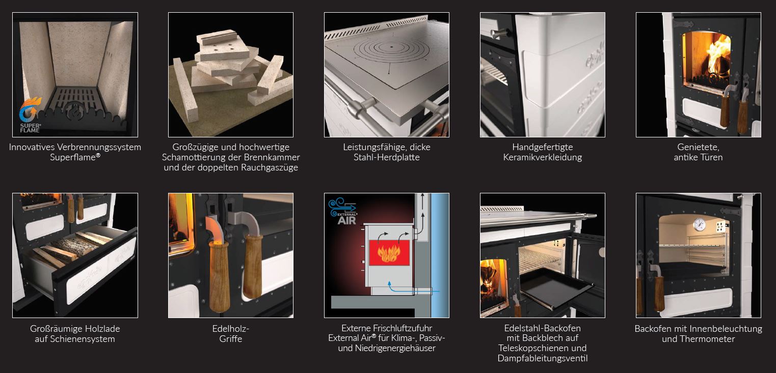 Ein nostalgischer Holzherd mit modernem Kern. Für die Modelle dieser Serie werden hochwertige Materialien ausgewählt. Die von Meisterhand handangefertigte Keramik aus Bassano del Grappa (Italien), die edlen Holzgriffe und die speziell, manuell bearbeiteten Türen mit Nieten erinnern an bereits vergangene Tage. Die Brennkammer ist mit zertifiziertem und wärmespeicherndem Material ausschamottiert. Der Edelstahl-Backofen garantiert ein optimales Backen. Jedes einzelne Element und die detaillierte Verarbeitung machen jeden dieser angefertigten Herde zu einem wertvollen Einzelstück. Das Resultat ist ein umweltfreundliches Produkt mit hervorragender Leistung, mit einer einzigartig, hochentwickelten Technik, die dem europäischem Standard entspricht und von externen Prüfstellen belegt und zertifiziert ist.