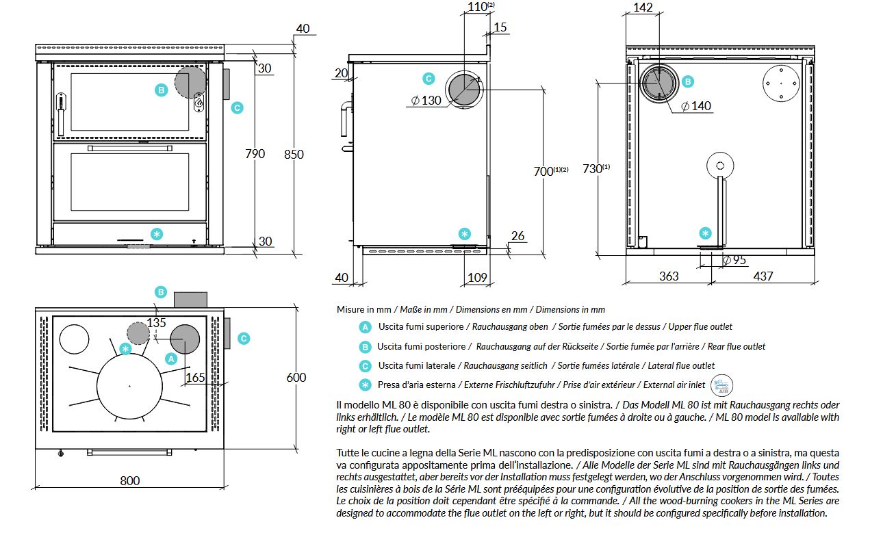 Die Serie M im präzisen und modernen Design unterscheidet sich durch die Maxi-Brennkammer, die eine ausgezeichnete Sicht aufs Feuer ermöglicht und durch den Maxi-Panorama-Backofen, der eine optimale Backofenfunktion garantiert. Die Serie MZ, eignet sich für den Einbau zwischen Möbel. Modelle dieser Serie sind mit einem Teleskop-Sockel ausgestattet, der die Anpassung der Herd-Höhe an die Möbel ermöglicht und somit eine maximale Installations-Flexibilität gewährt. Die Serie ML, die nun auch in der neuen Ausführung Rustik mit Keramik- oder Serpentinsteinverkleidung erhältlich ist, ist mit einem großen Maxi-Backofen für ein kompromissloses Backen ausgestattet.