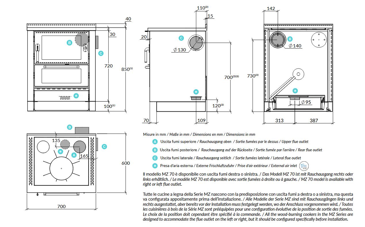 Die Serie M im präzisen und modernen Design unterscheidet sich durch die Maxi-Brennkammer, die eine ausgezeichnete Sicht aufs Feuer ermöglicht und durch den Maxi-Panorama-Backofen, der eine optimale Backofenfunktion garantiert. Die Serie MZ, eignet sich für den Einbau zwischen Möbel. Modelle dieser Serie sind mit einem Teleskop-Sockel ausgestattet, der die Anpassung der Herd-Höhe an die Möbel ermöglicht und somit eine maximale Installations-Flexibilität gewährt. Die Serie ML, die nun auch in der neuen Ausführung Rustik mit Keramik- oder Serpentinsteinverkleidung erhältlich ist, ist mit einem großen Maxi-Backofen für ein kompromissloses Backen ausgestattet.