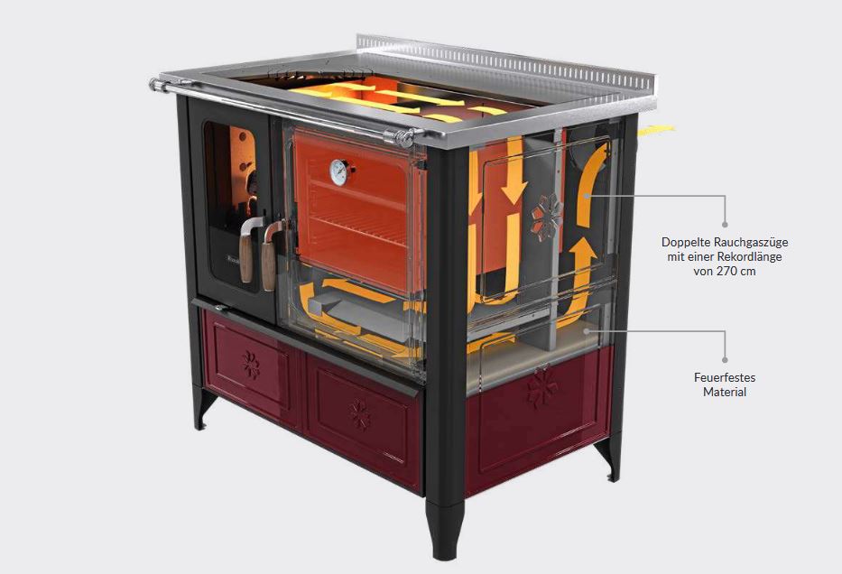 • Feuerraum- und Backofentür mit Dichtungen aus Metalldrahtgeflecht