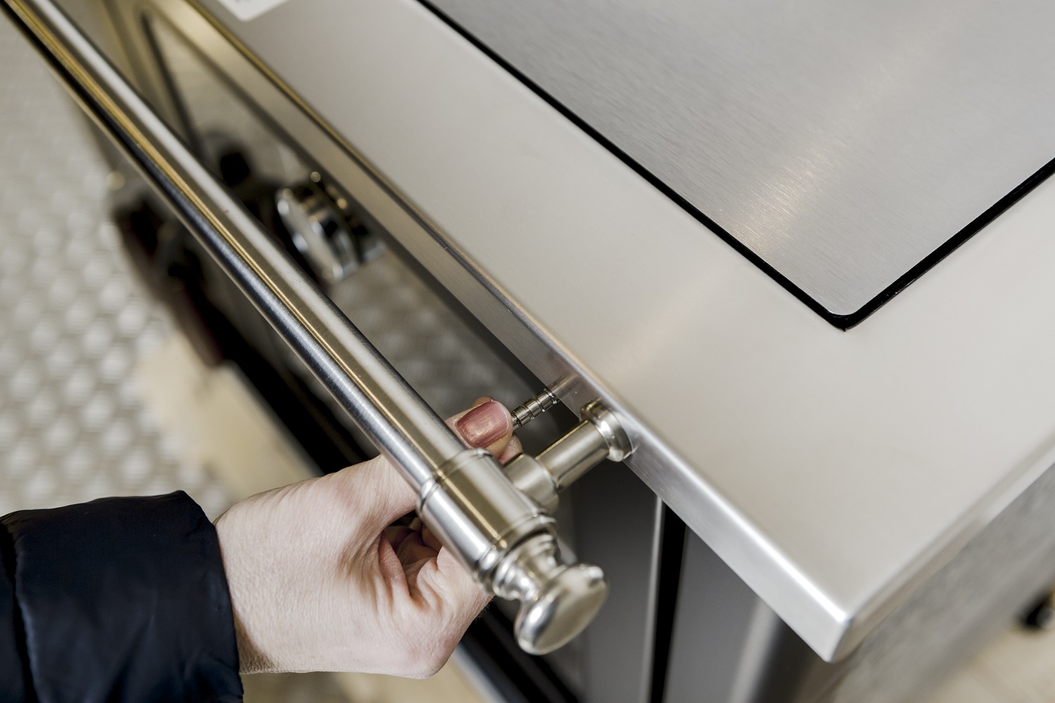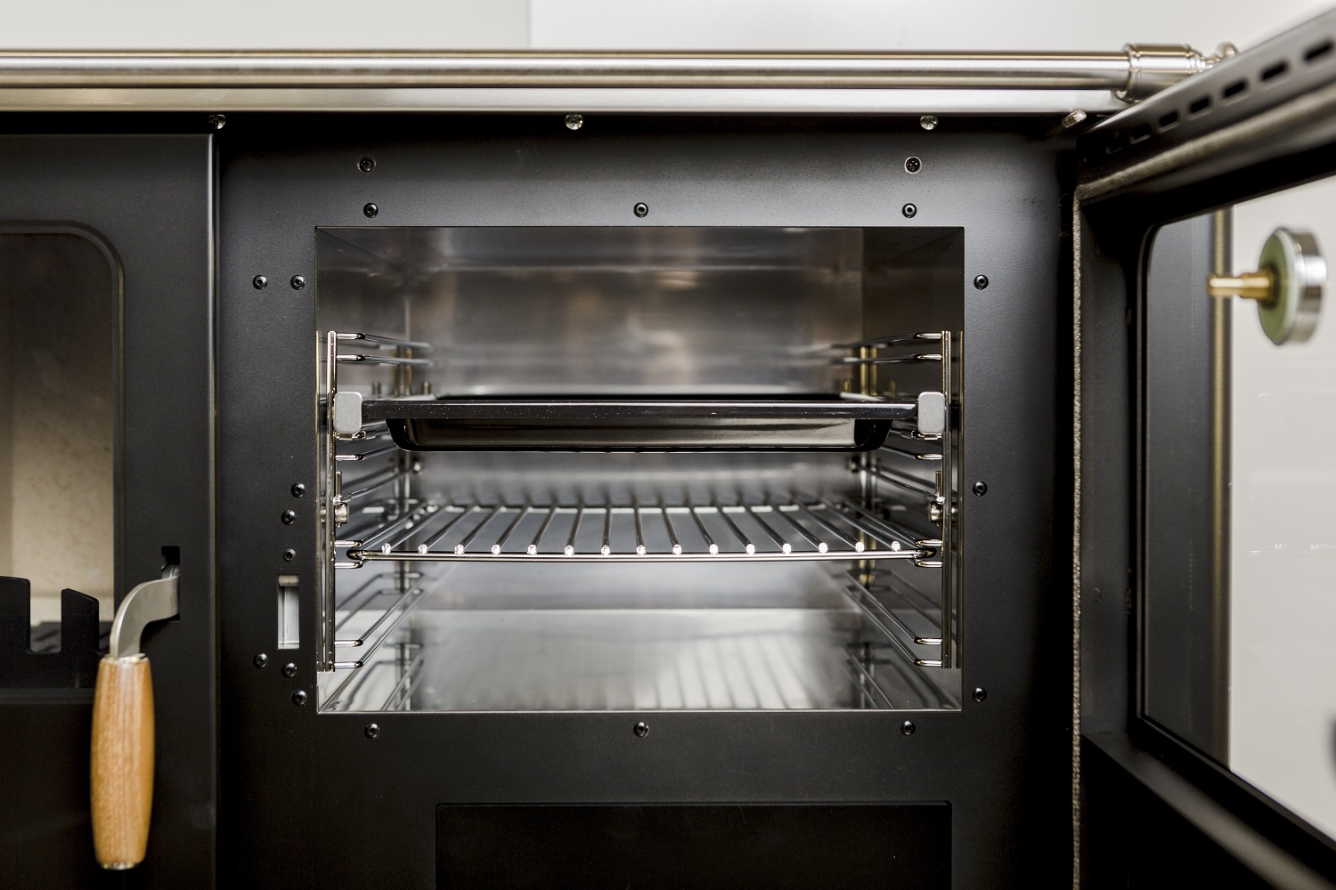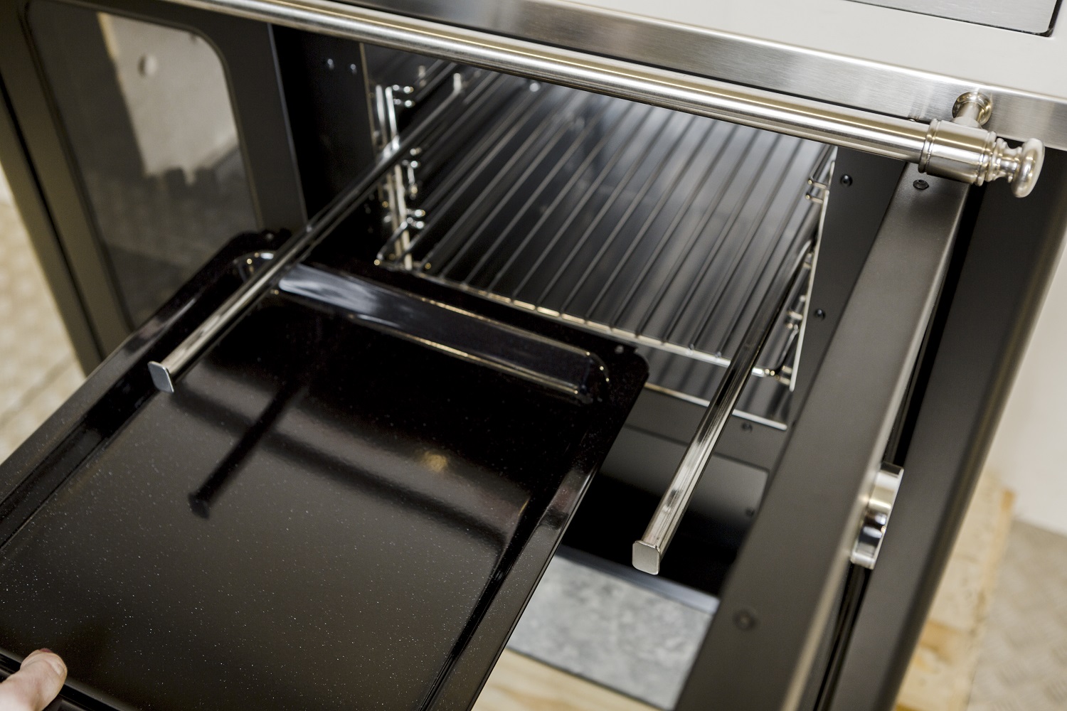Die serienmäßige Spitzenausstattung von Rizzoli-Backöfen beinhaltet: Thermometer, Grillrost, emailliertes, pyrolytisches Backblech auf Teleskopschienen und eine Backofentür mit großer Scheibe mit Siebdruck.