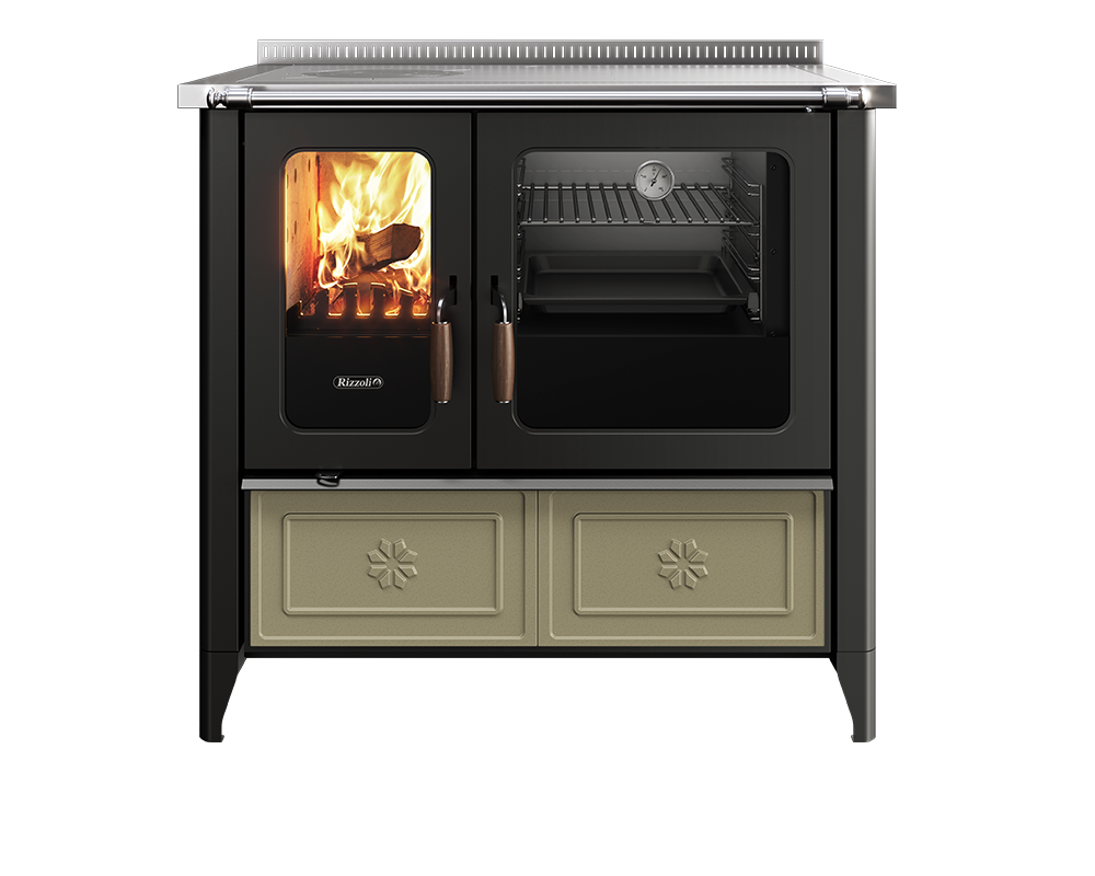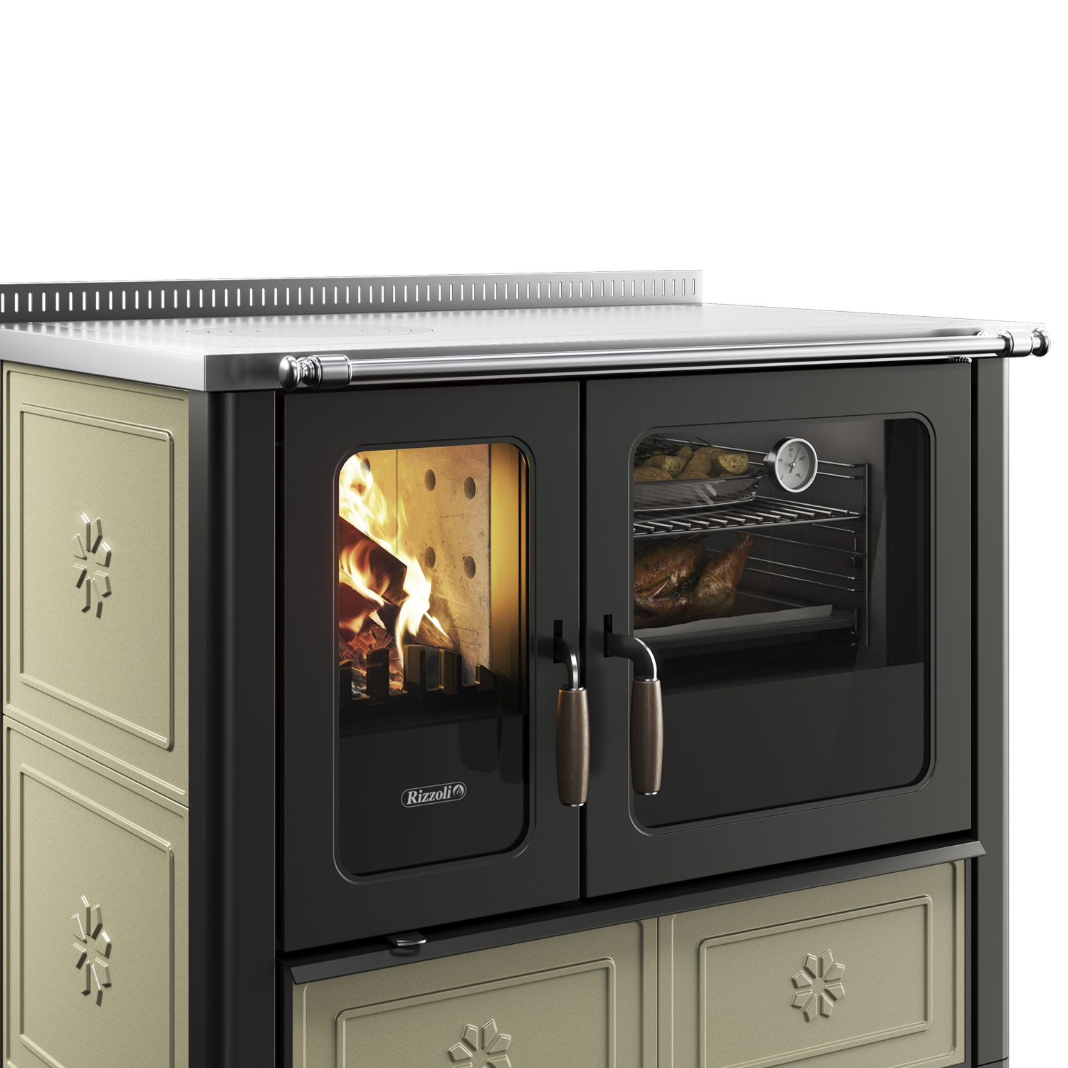 Die neue Serie N kennzeichnet sich durch den Einsatz der besten verfügbaren Techniken und die ausgewählten Rohstoffe. Der hochwertige Stahl, die Brennkammer aus zertifiziertem feuerfestem Material und die spezielle Stahl-Herdplatte-Elemente, die die Produkte von Rizzoli seit jeher auszeichnen – harmonieren perfekt mit der von Meisterhand handangefertigten Keramik-Verkleidung aus Bassano del Grappa (Italien), dem Serpentinstein und den edlen Griffen aus Nussbaumholz.