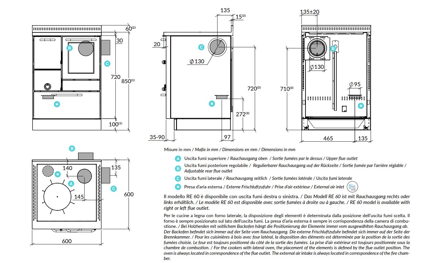 Bei den Modellen der Serie R, M und FE mit der Durchheize hinten kann der Herdrahmen mit einer Tiefe zu 600 mm nur realisiert werden, wenn dieser OHNE Wischleiste geplant wird.