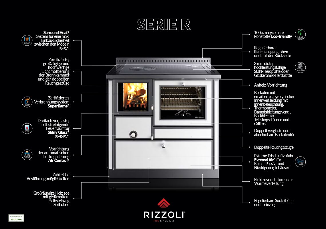 Rizzoli-Holzherde der Serie RVI wurden eigens für eine max. Einbau-Sicherheit zwischen den Möbeln entwickelt. Mit dem Surround Head System sind keine weiteren Hitzeschutz-Vorrichtungen nötig. Die neue Rizzoli-Technologie und der geräumige, beleuchtete Backofen ermöglichen grenzenlose Kochmöglichkeiten. Holzherde der Serie RVI sind mit einer großen Brennkammer ausgestattet. Die spezielle Feuerraumtür mit dreifach verglastem, selbstreinigendem Sichtfenster garantiert eine ausgezeichnete Sicht aufs Feuer. Zur Auswahl stehen zahlreiche Ausführungs- und Personalisierungsmöglichkeiten.
