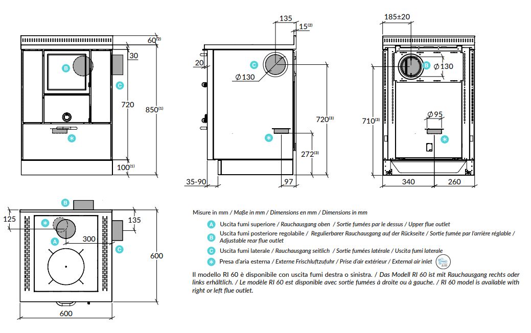 Bei den Modellen der Serie R, M und FE mit der Durchheize hinten kann der Herdrahmen mit einer Tiefe zu 600 mm nur realisiert werden, wenn dieser OHNE Wischleiste geplant wird.