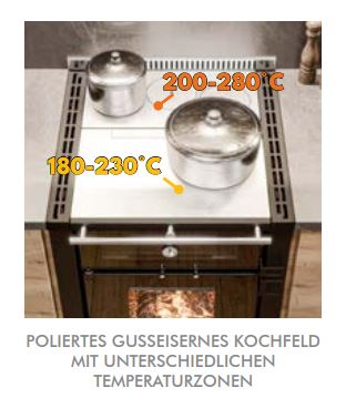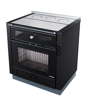 Holzherd zur Freiaufstellung oder Einbau geeignet. Mit einem Back-Ofen aus emailliertem Gusseisen, welcher gut einsehbar und ergonomisch ist, da er oben über der Brennkammer platziert wurde. Auf diese Weise ist eine einfache Bedienung, hohe Temperaturen, eine einfache Reinigung und Wartung garantiert.