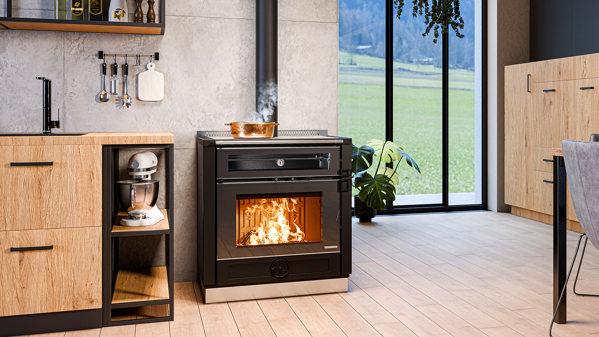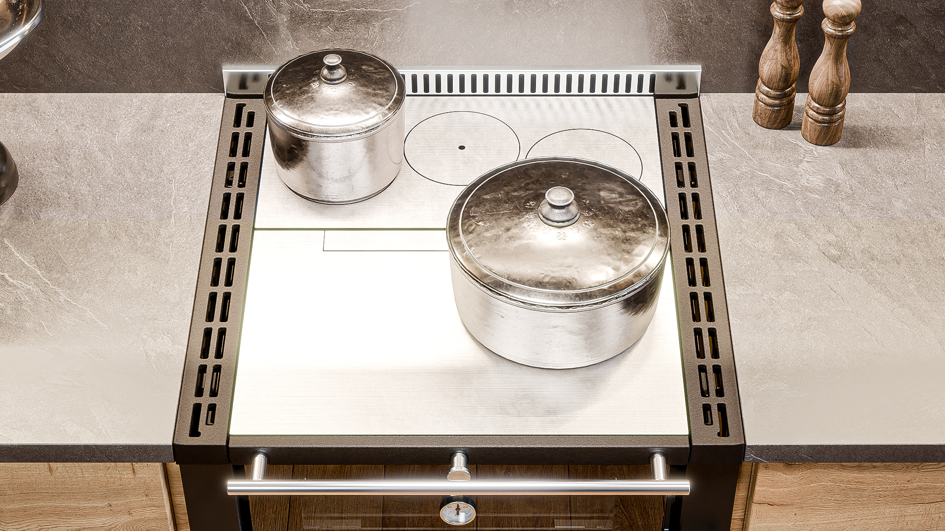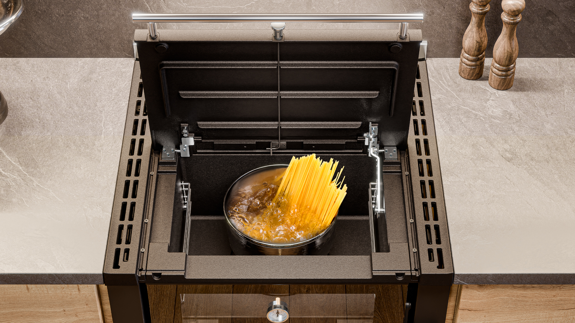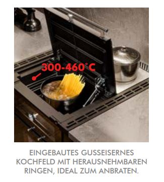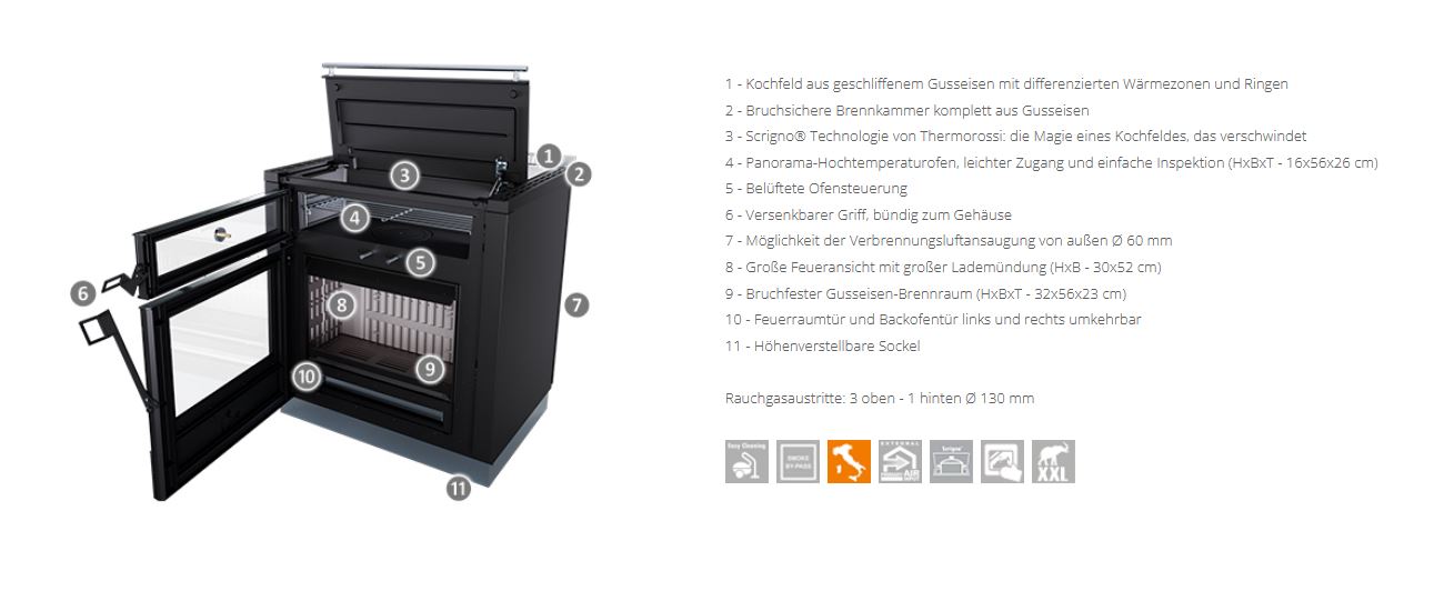Das Scrigno-Patent von Thermorossi: Entdecken Sie ein Hochtemperatur-Kochfeld, um zu gratinieren, zu braten oder einfach schneller zu garen (Booster-Funktion) und einen Backofen mit Frontzugangstür, Thermometer und Steuerung für die natürliche Belüftung.