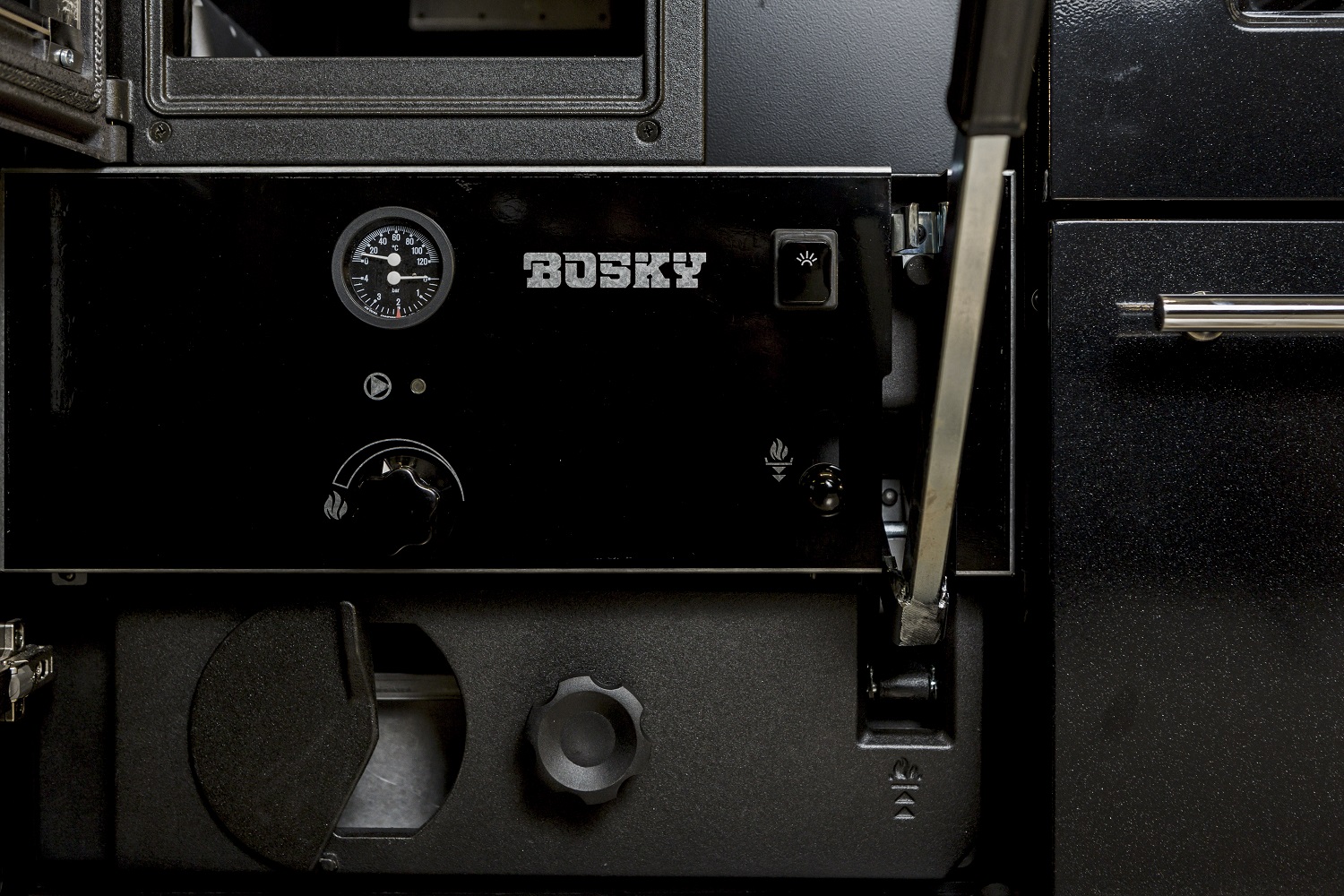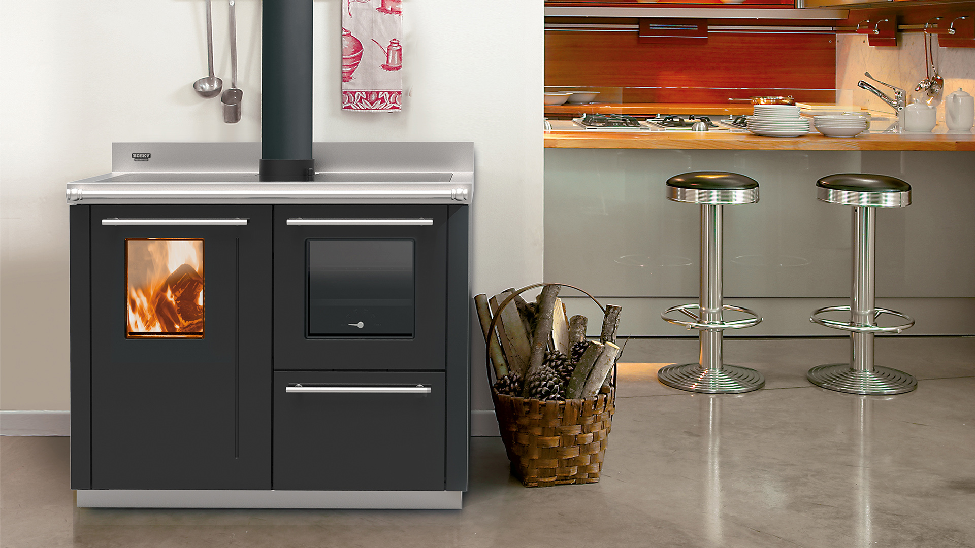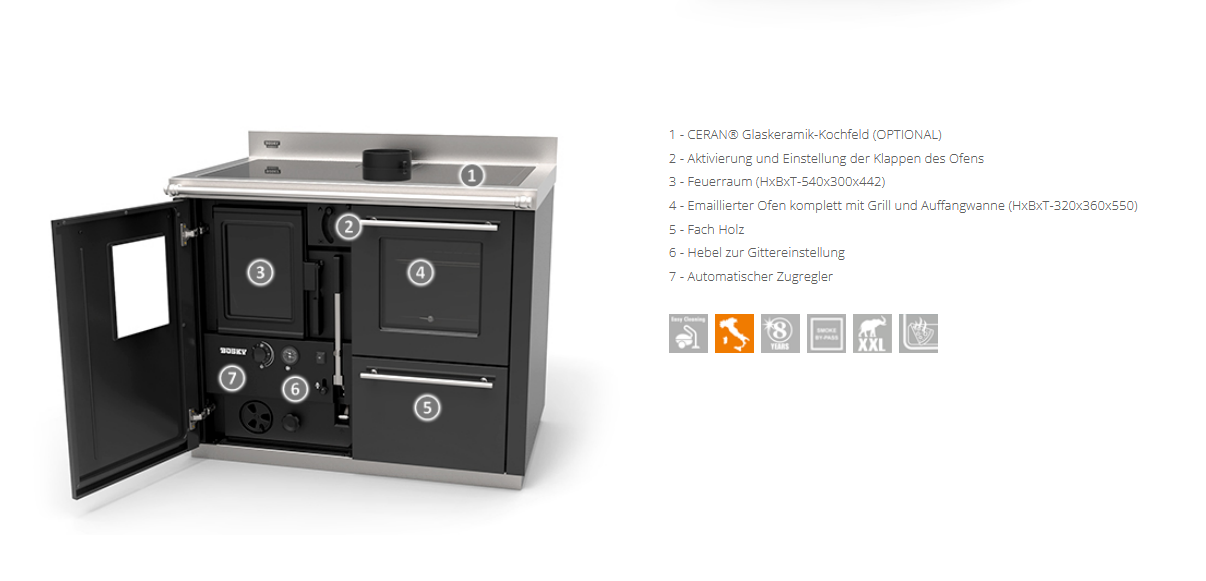 Entwickelt nach den neuesten Sicherheitsstandards und der Normen Europas, ein Produkt der Spitzentechnologie, enstanden auch mit den 50 Jahren Erfahrung in der Produktion von Heizkesseln und Heizungskuechenherd. Über die hydraulischen Anlage heizt Bosky-F das ganze Haus, und möbliert mit ihren Details.