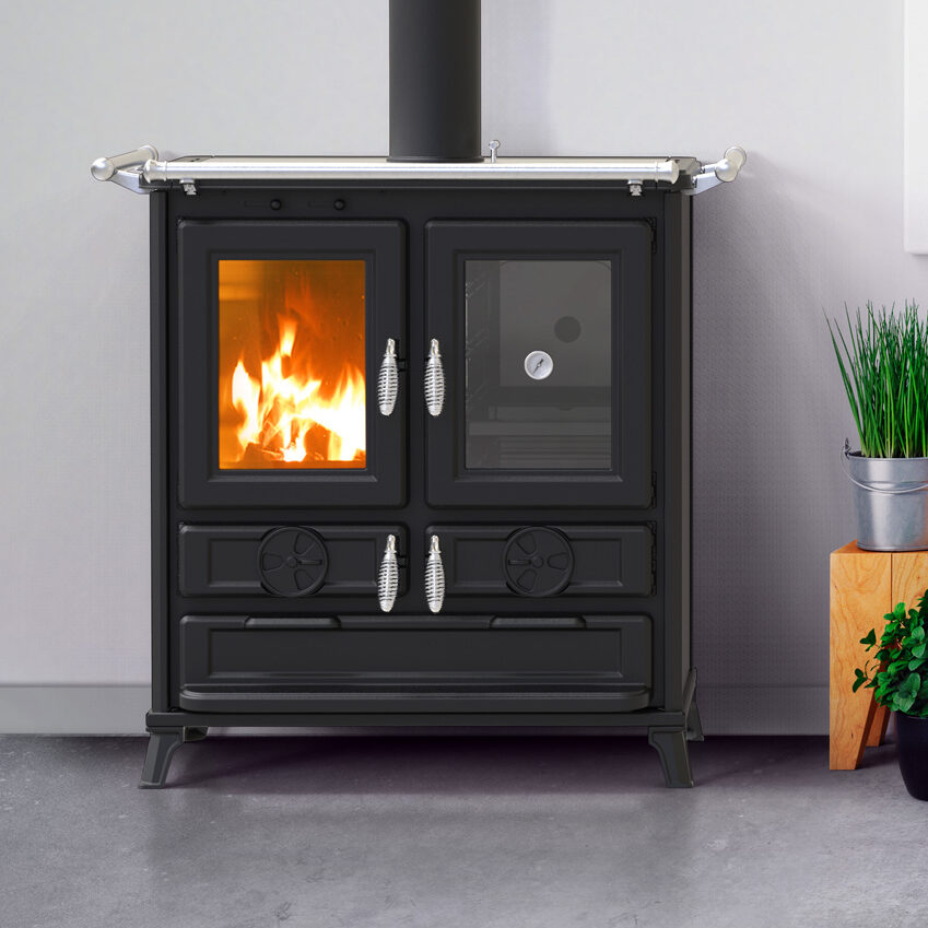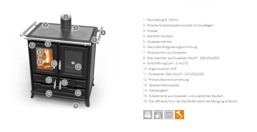 • Feuerraumtür und Brennkammer aus Gusseisen