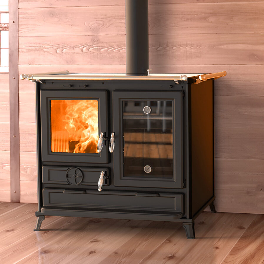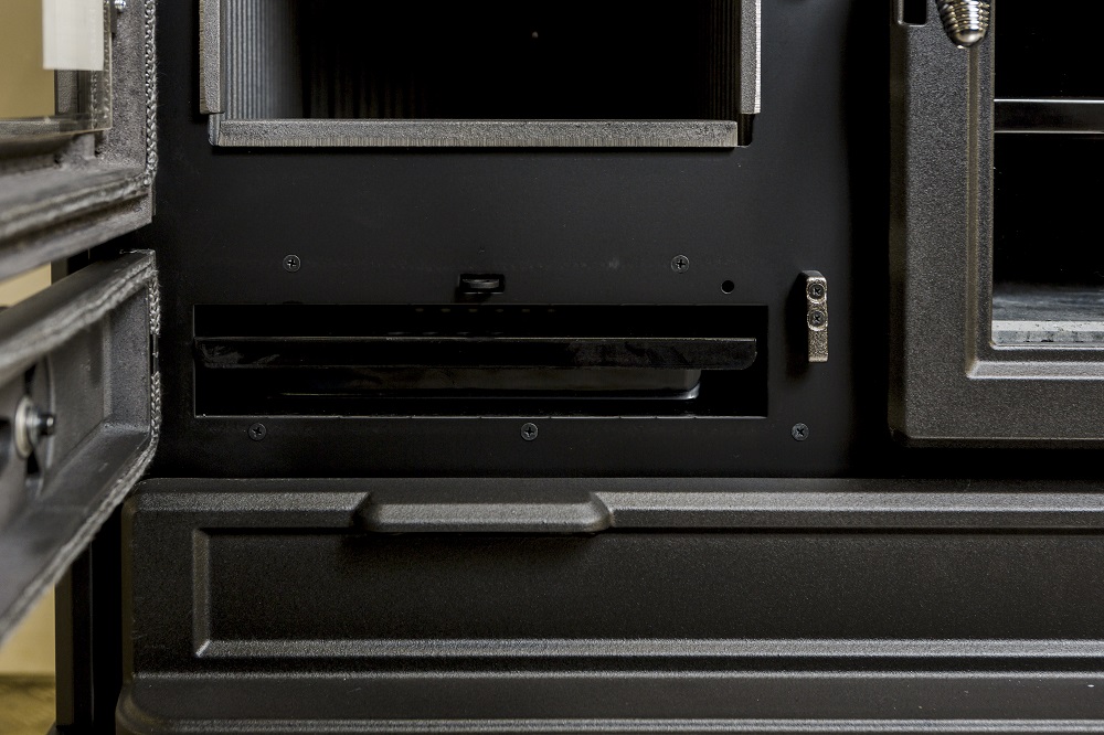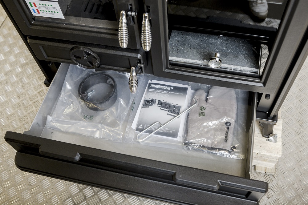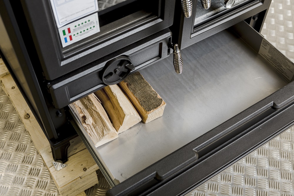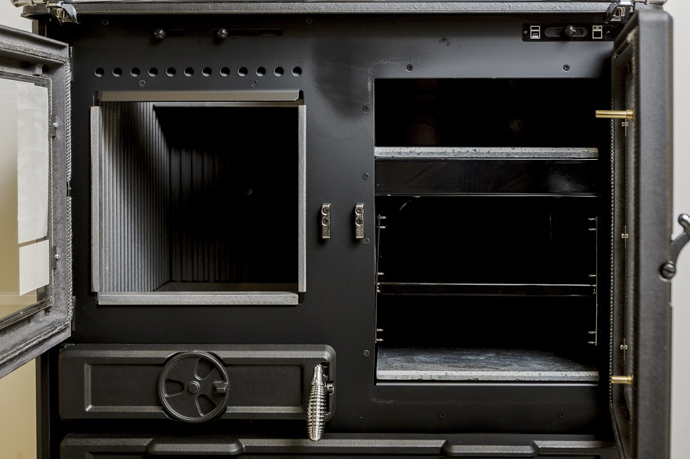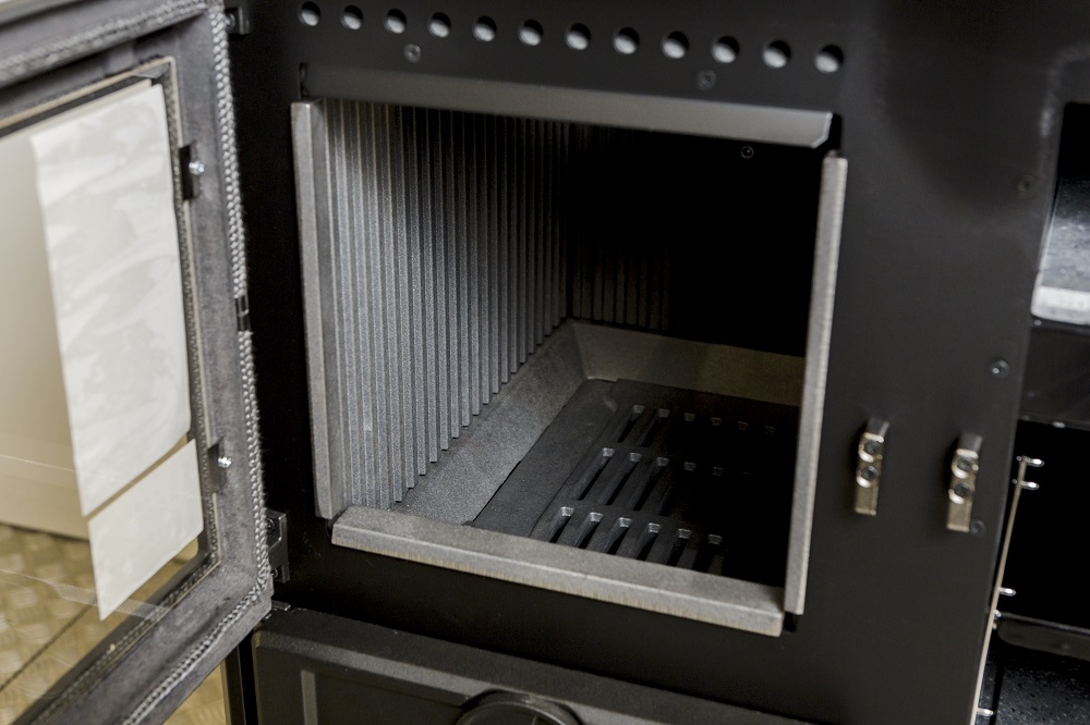 • Feuerraumtür und Brennkammer aus Gusseisen