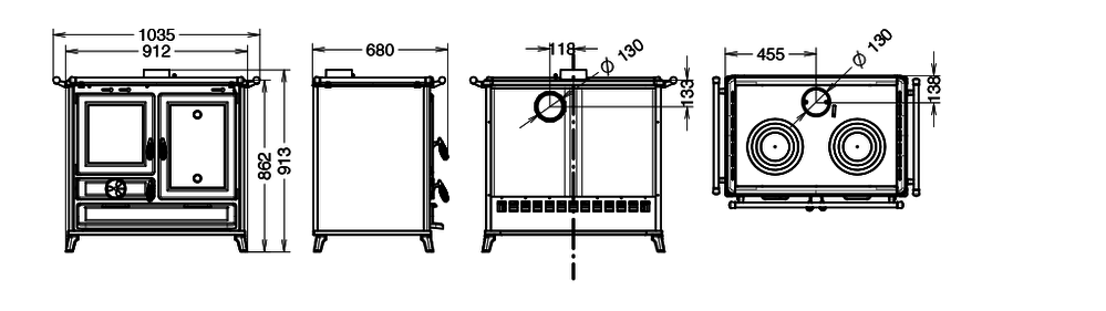 • Maße Feuerraum (L x H x T): 305 x 364 x 482  mm